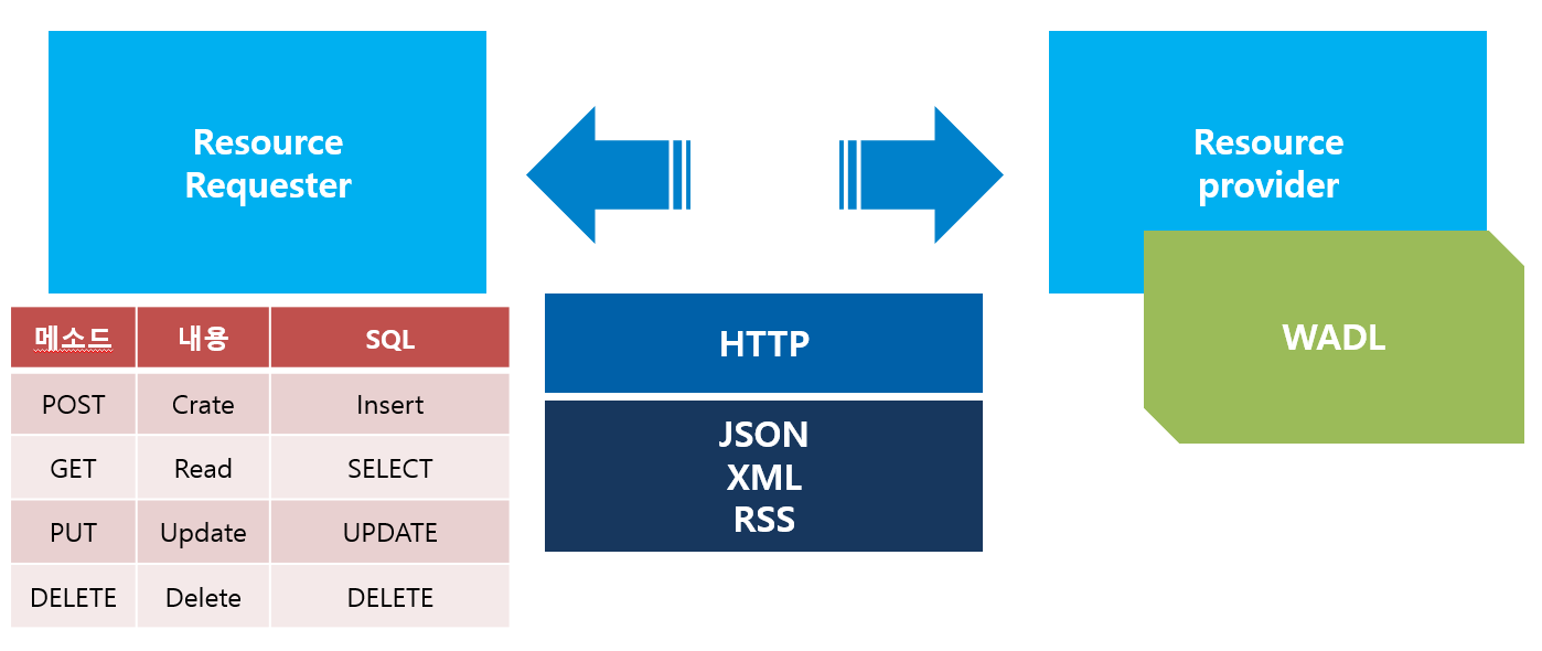 - 기본 HTTP프로토콜의 메소드 GET/PUT/POST/DELETE를 이용하여 서비스 제공자에게 서비스 요청
