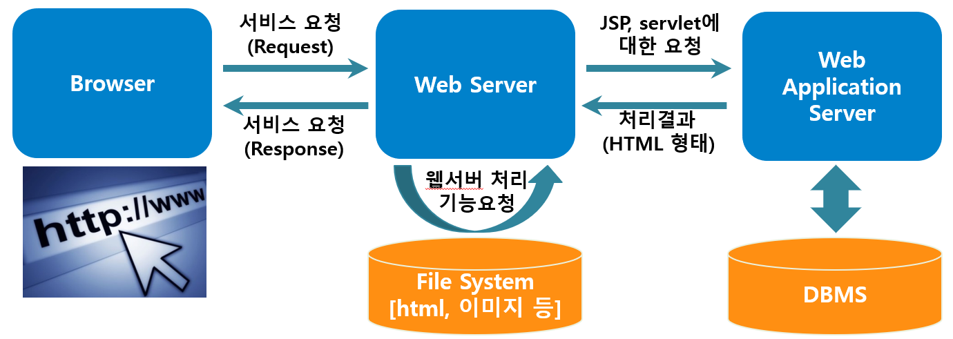 - 사용자가 브라우저에서 요청 후 WEB 서버와 WAS 서버를 통해 응답을 받게 됨