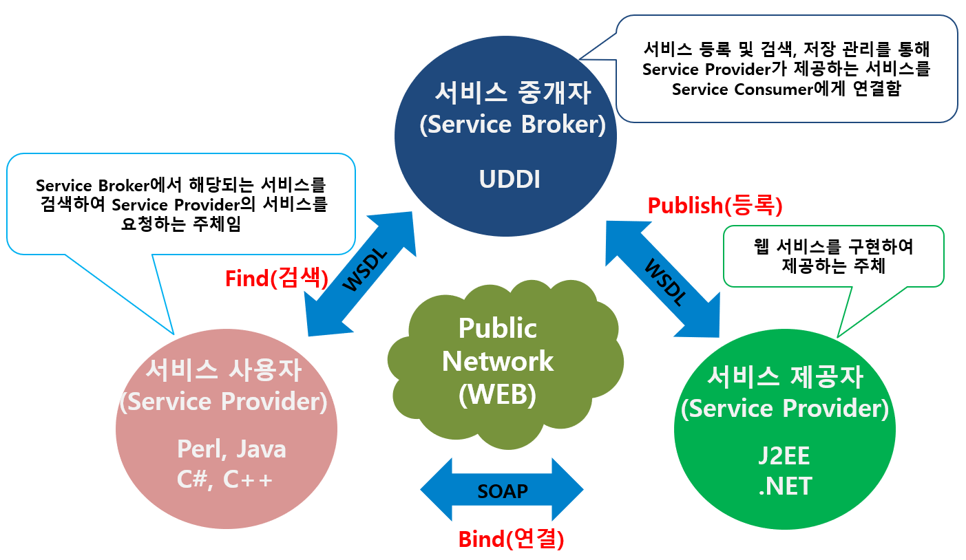 - 웹 서비스를 제공하기 위한 표준(WSDL, UDDI) 정립