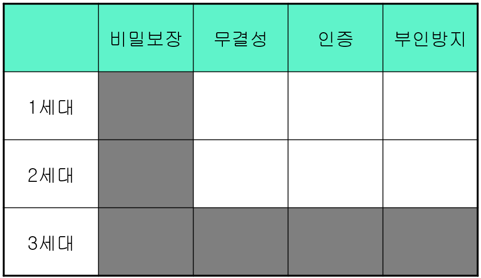 고대암호(1세대), 근대암호(2세대), 현대암호(3세대) 각 시대별 암호를 이용한 특성을 봤을 때 시대별 사용하는 사람과 용도에 따라 다르다는걸 알 수 있는데요 1~2세대는 군사적 목적으로 암호를 사용했기때문에 비밀보장(기밀성) 특성을 가지고 있고, 3세대인 현대암호에서는 인터넷과 전자상거래 등 사용하는 범위가 누구나 사용할 수 있게 되어 암호를 활용하는 부분이 넓어지면서 비밀보장(기밀성), 무결성, 인증, 부인방지이 암호 서비스 특성이 생기게 된거죠~