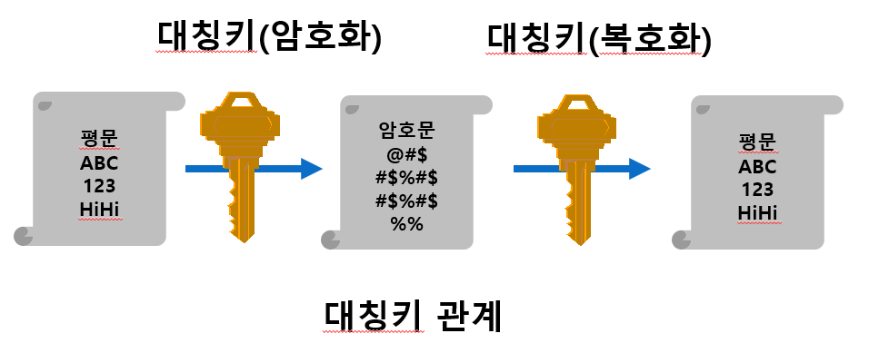 - 암호화 키와 복호화 키가 서로 같음