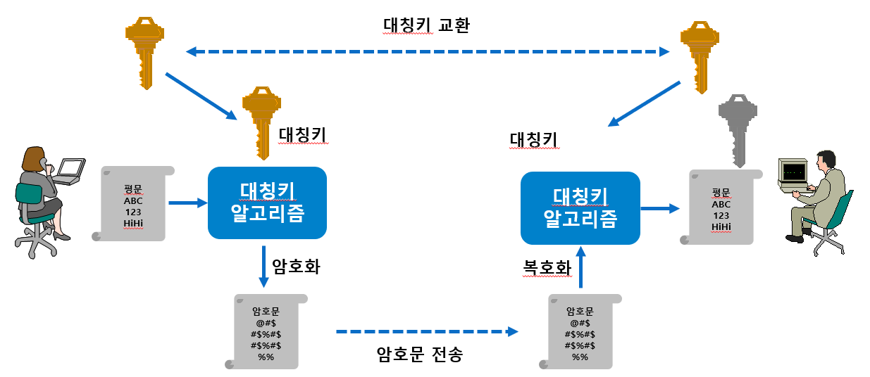 1. 송신자는 평문을 대칭키 알고리즘과 대칭키를 통해 암호화하여 암호문을 수신자에게 전송한다