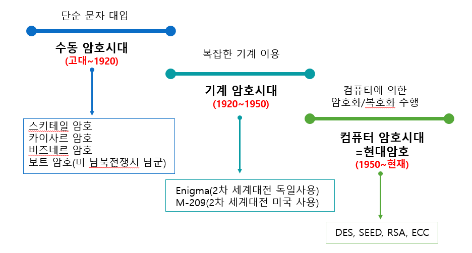 현대 암호 : 컴퓨터 산업의 발달과 수학적 배경을 기본으로 발전, (대칭키)DES, 3DES, (공개키)RSA, ELGamal, ECC